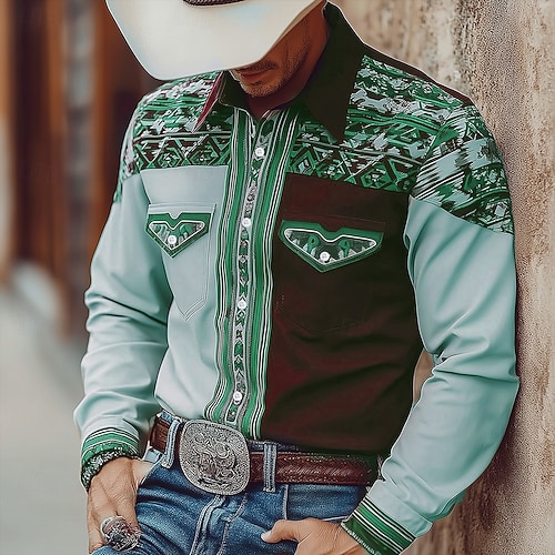 Per uomo Azteco Motivo Geometrico Etnico Camicia Camicia Western Camicia da cowboy Manica Lunga Vintage Retrò All'aperto Casuale Abbigliamento da lavoro Primavera Autunno Collo ripiegato Due tasche