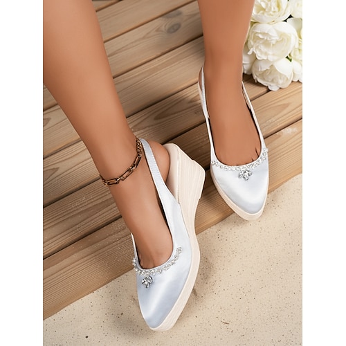 scarpe da damigella d'onore con zeppa azzurra da donna - cinturino posteriore in raso con decorazioni in strass, comode zeppe basse, stile elegante per matrimoni in spiaggia