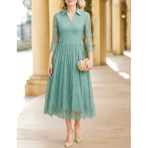 Linea ad A Lunghezza Tè Vestito da Festa Abito da Cocktail Abito da invitata a nozze Abito da cerimonia per signora Manica 3/4 Scollo a V Elegante Formale Serata Formale Ricevimento di matrimonio