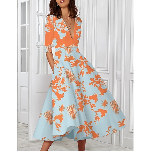 Linea ad A Lunghezza Tè Abiti da Cocktail Elegante Manica 3/4 Scollo a V Festa in giardino Matrimonio Raso con Stampa floreale