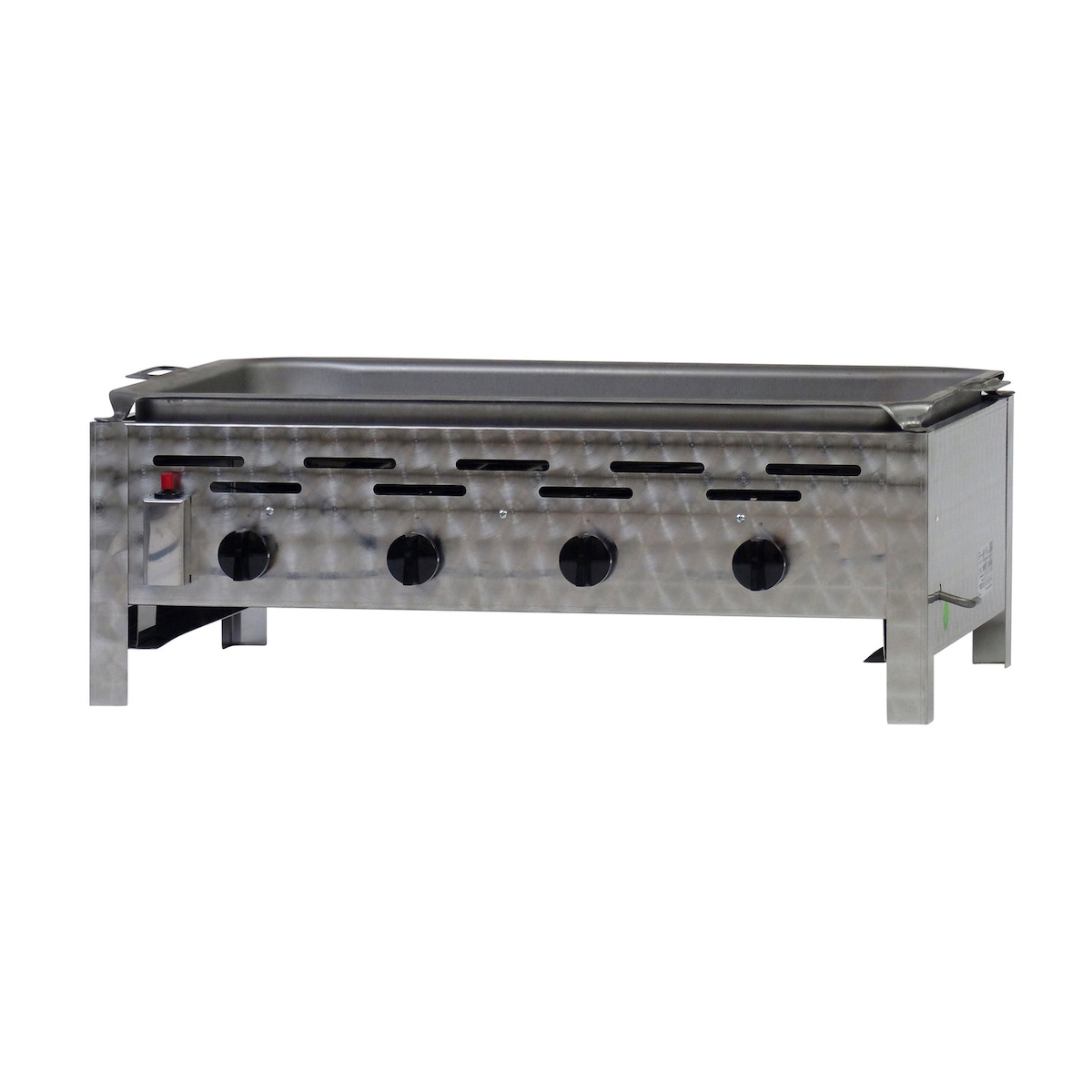 Gastrobräter, 4 Brenner je 4,5 kW, mit Stahlblechpfanne, B 810 mm x T 530 mm x H 270 mm, inkl. Gewerbedruckregler u. Schlauchbruchsicherung