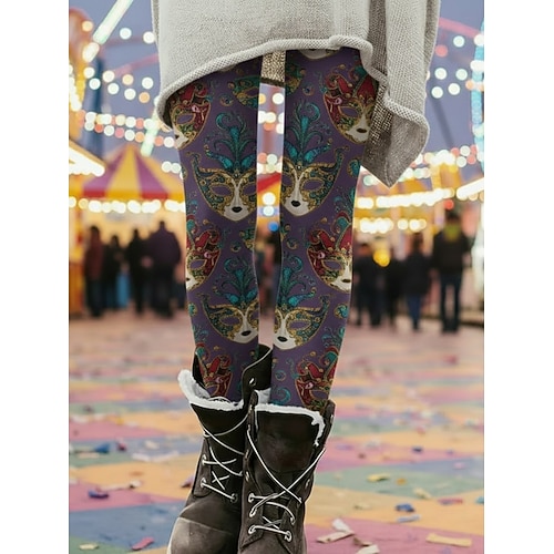 Karnevals-Leggings für Damen, bequeme Leggings im Vintage-Ethno-Stil, lange Hose mit hohem Bund, Grafikprint, komfortabel, dehnbar, lässig, für Alltag und Urlaub, tiefviolett