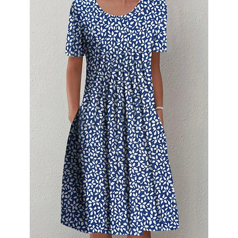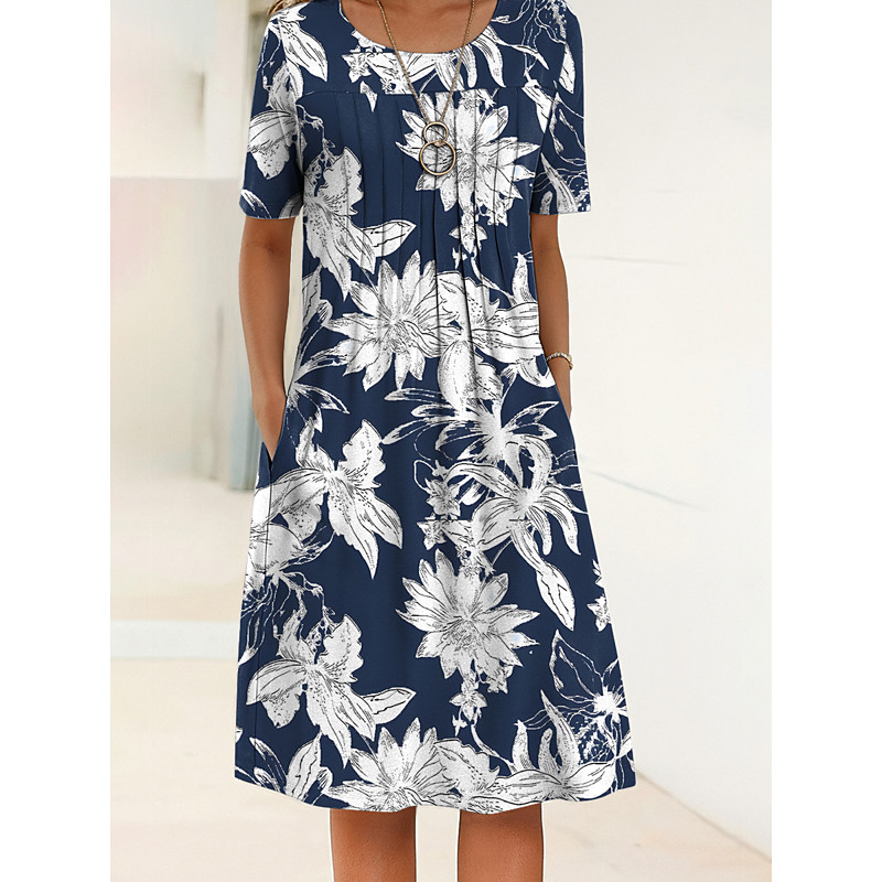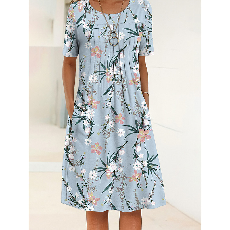 Women's Midi Dress V-Neck Floral Print Short Sleeve A-Line Comfort Blue Beach Party Spring Summer Fashion Clothing Apparel