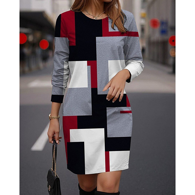 Women's Mini Dress Casual Dress Print Dress Fashion Modern Daily Date Weekend Regular Fit Geometric Color Block Long Sleeve V Neck Pink Red Gray Spring Fall