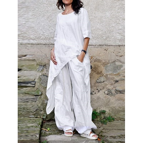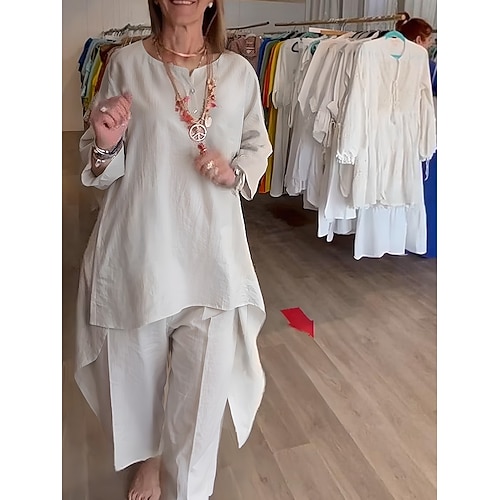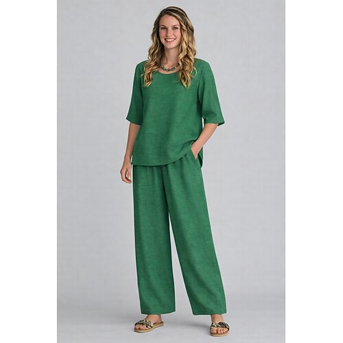 completi da donna in cotone e lino, completi da casa comodi e alla moda, tinta unita, arancione, rosso, blu navy, nero, bianco, verde scuro, primavera autunno