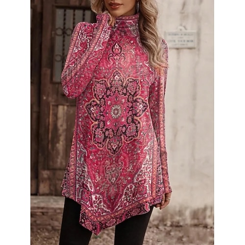 Per donna Maglietta Floreale Grafico Piante Casual Manica Lunga Dolcevita Top lunghi Quotidiano Stampato Asimmetrico Bianco e nero Rosso Verde Primavera Autunno