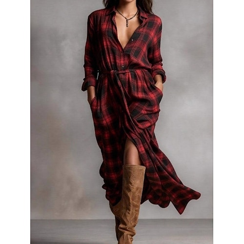 Per donna Abito Midi Abito a trapezio Vacanza Casual Quotidiano Vestibilità regolare Plaid Manica Lunga Colletto a Camicia Rosso Primavera Autunno