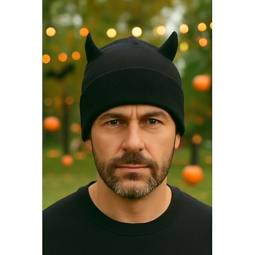 Unisex-Halloween-Teufelshorn-Beanie-Mütze – gestrickte warme Totenkopfmütze mit 3D-Hörnern für Männer und Frauen, Cosplay-Partykostüm und Outdoor-Bekleidung
