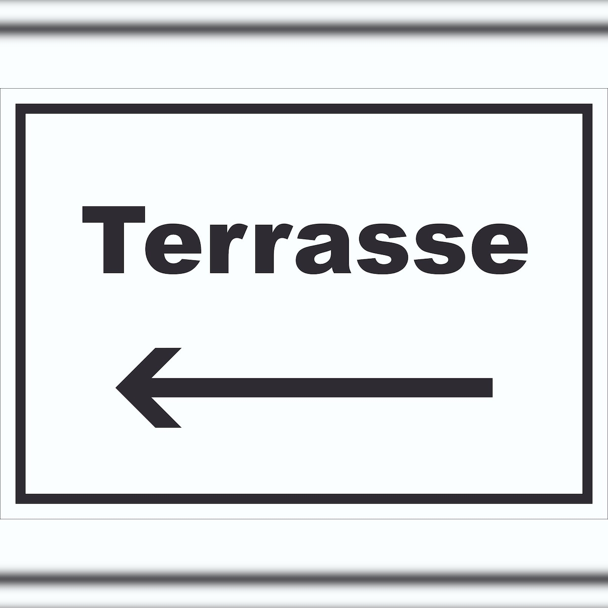 HB-Druck Terrasse Schild mit Text und Richtungspfeil links waagerecht A2 Rückseite selbstklebend
