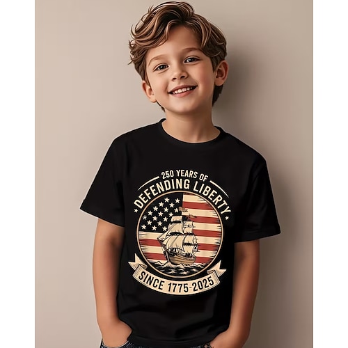 100% Cotone Bambini Ragazzi Nero Bianco Nave Bandiera USA 250° anniversario Maglietta Blusa Girocollo Manica Corta All'aperto Abbigliamento Quotidiano Moda Streetwear Designer Stampa Estate