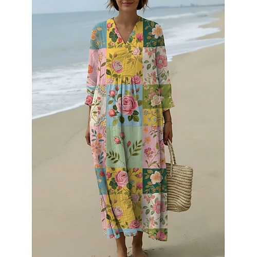 Per donna Abito maxi Abito a Tubino Vacanza Casual All'aperto Uscire Vestibilità comoda Floreale Manica Lunga Collo ripiegato Blu Giallo Fucsia Verde Estate Primavera Autunno