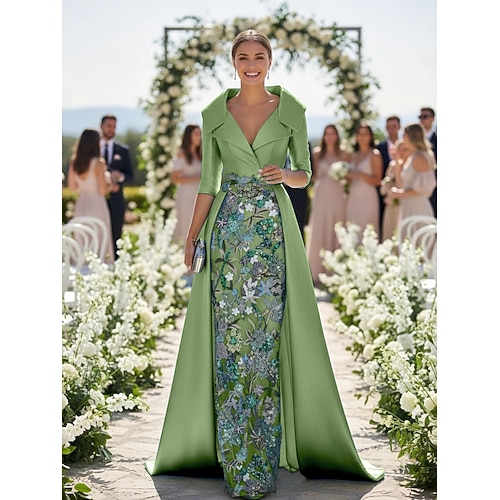 Linea ad A Tubino Colonna Lunghezza al pavimento Perline ricamate Abito da invitata a nozze Abito Formale Abito da cerimonia per signora Manica 3/4 Scollo a V Colletto a Camicia Elegante Vintage