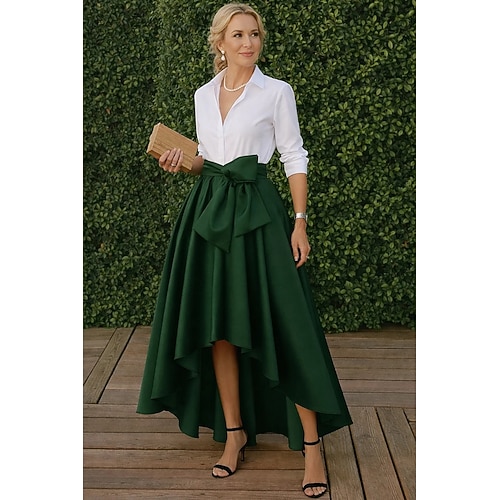 Linea ad A Set di Abiti Lunghezza Tè Abito da invitata a nozze Abito da cerimonia per signora Manica Lunga Manica 3/4 Colletto a Camicia Elegante Vintage Semplice Formale Ospite di nozze Raso con
