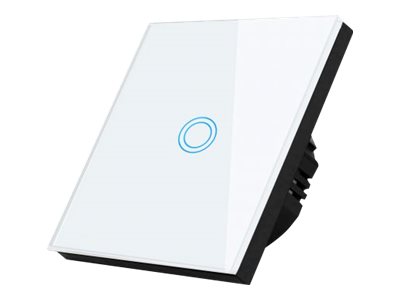 Maclean MCE702B kosketusvalokytkin, yksittäinen, lasi, musta, pyöreä painike, mitat 86x86mm, painikkeen valaistuksella varustettuna