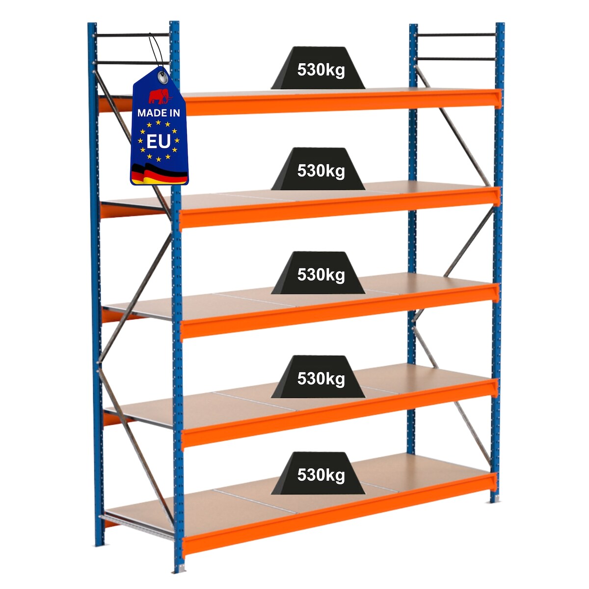 PROREGAL Industrie Schwerlastregal MAXIMUS PRO, Grundregal, HxBxT 300x250x80cm, 5 Ebenen, Spanplatten-Fachboden, Fachlast 530 kg, Blau/Orange
