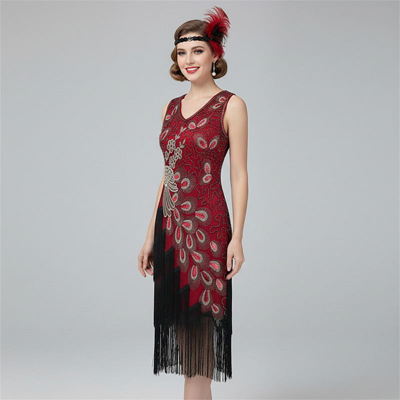 Retro Vintage Roaring 20s 1920s Knee Length Flapper Dress Dress Fancy Costume Plus Size Sleeveless The Great Gatsby Charleston Sequins Tassel Fringe Feather V Neck Fancy Dress Women's Carnival New