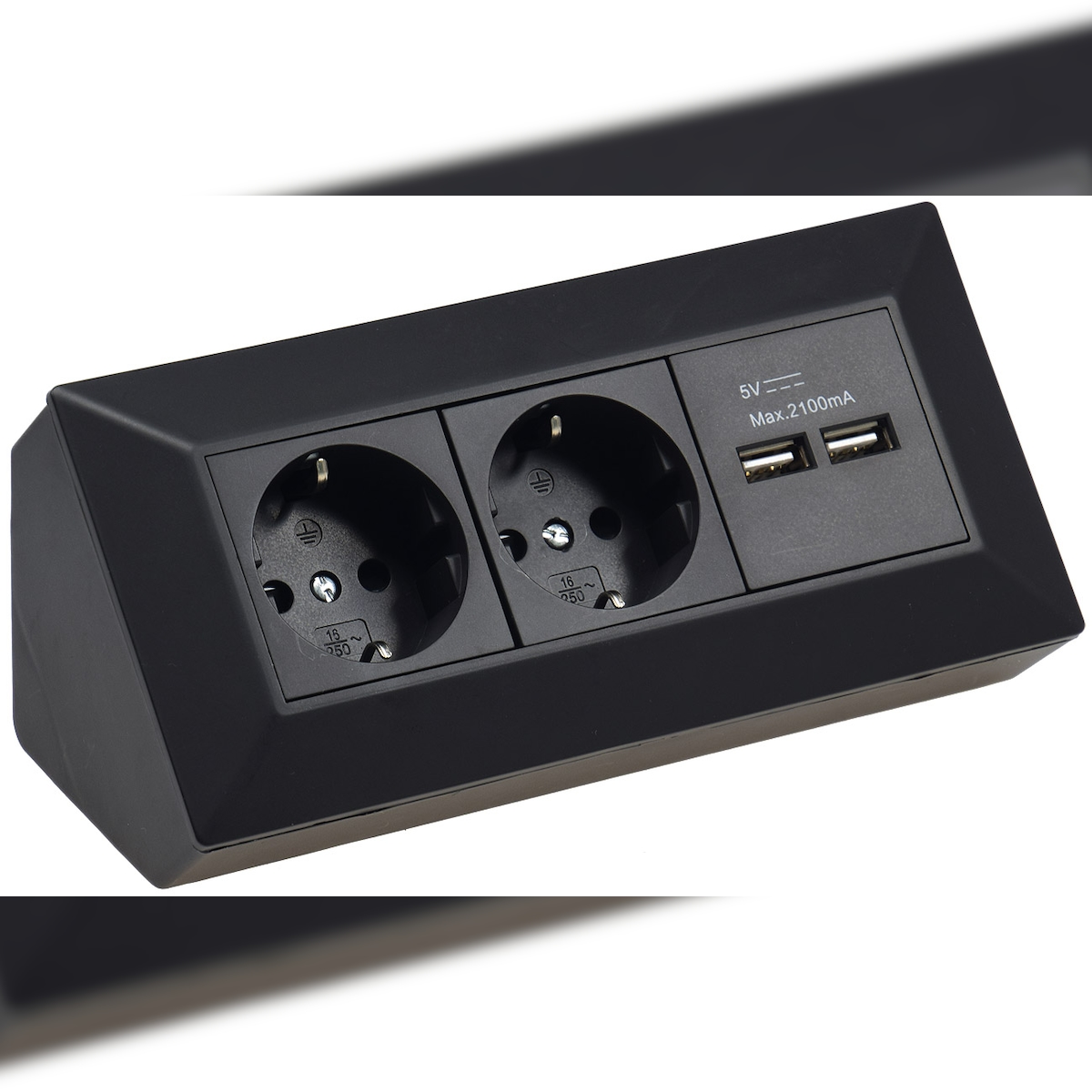 ChiliTec 2-fach Steckdosenblock + 2x USB schwarz 250V AC / 16A Aufbaumontage Neue Version