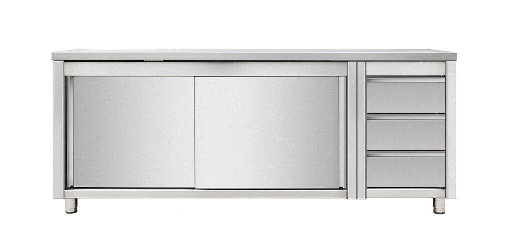Skyrainbow Arbeitsschrank mit Schiebetüren und Schubladenblock rechts, 1600 x 700