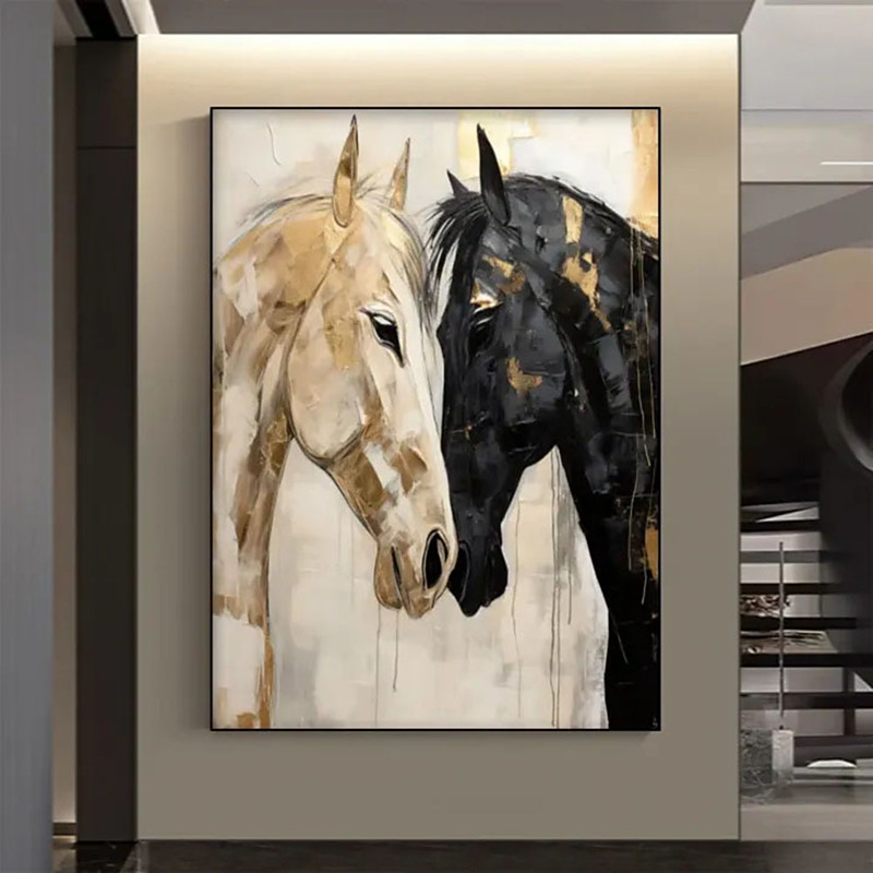 Handmade 3D Oil Painting Two Horses Portrait with Vibrant Gold Black Cream Tones Detailed Brushstrokes Layered Texture Rich Artistic Expression Modern Home Decor