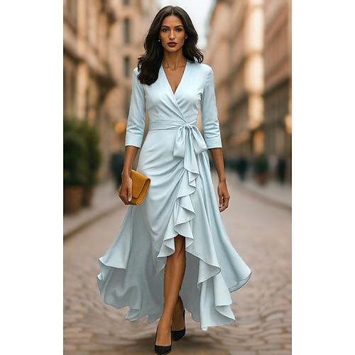 Linea ad A Asimmetrico Abito da Sera Elegante Manica 3/4 Scollo a V Matrimonio Formale Tasca Raso con Fiocco/Fiocchi Volant