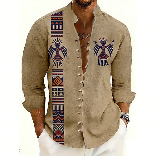 Herren Geometrisch Ethik / Afrikanisch Indigene Völker Hemd Stehkragenhemd Langarm Vintage-Retro Lässig Urlaub Frühling Herbst Mandarinkragen Stehkragen Button-Down Leinenähnliches Hemd Blau Gelb