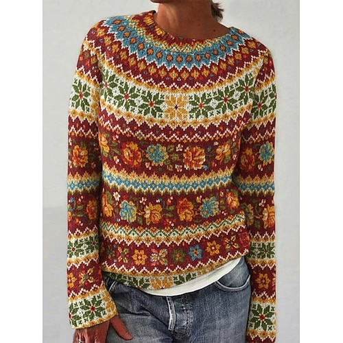 Per donna Maglione natalizio Fair Isle Felpa Maglione Vacanza Vintage Quotidiano Floreale A Coste Girocollo Lavorato a maglia Stampato Manica Lunga Top Regolari Maglia All'aperto Weekend Rosso