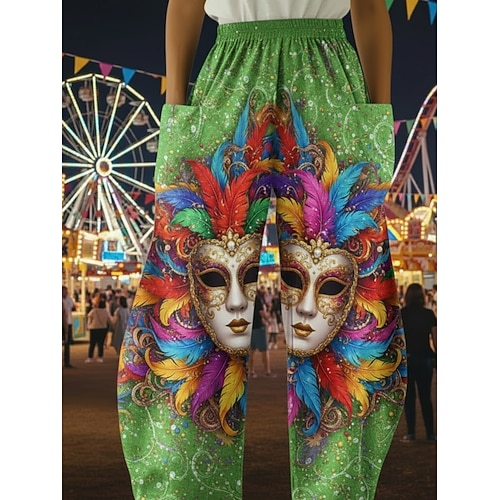 Damen-Chinos mit weitem Bein im Karnevalsstil, ideal für Urlaub, Urlaub, Vintage- und Ethno-Look, lange Hose mit hohem Bund, Grafikprint, Kordelzug, Tasche, elastischem Bund, bequem, atmungsaktiv,