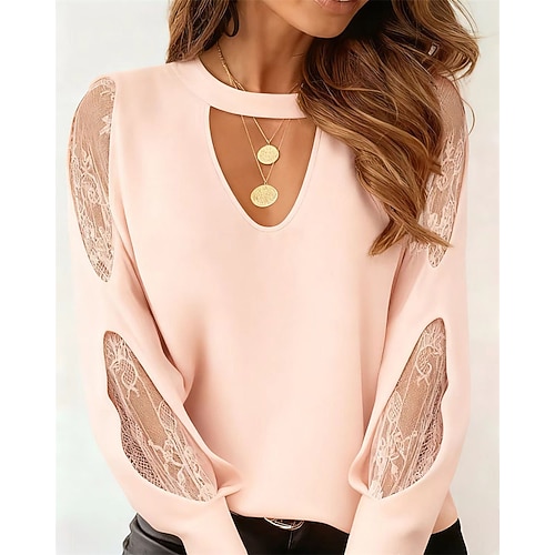 Per donna Blusa Semplice Elegante Manica Lunga Girocollo Top Regolari Ferie Uscire Bordo in pizzo Fiocco Nero Estate Primavera Autunno Inverno