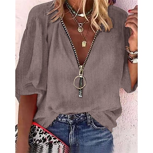 Per donna Blusa Top Eleganti Tinta unica Semplice Elegante Signore Essenziale Manica 3/4 Scollo a V Top Regolari Quotidiano Lavoro Uscire Arricciato Patchwork Cerniera Nero Cammello Estate Primavera