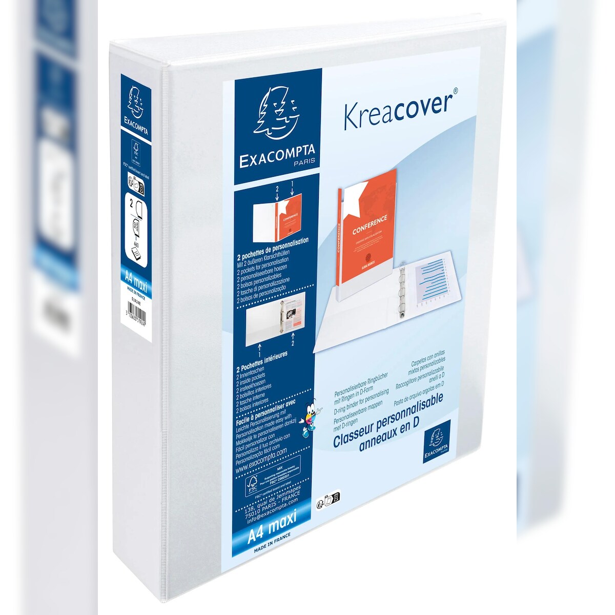 Exacompta 51924E 10x Ringbuch aus PP 2,3mm, 2 Ringe 50mm, Rücken 75mm, 2 äußere Klarsichthüllen, 32x29,5cm für DIN A4 MAXI - Kreacover - Weiß