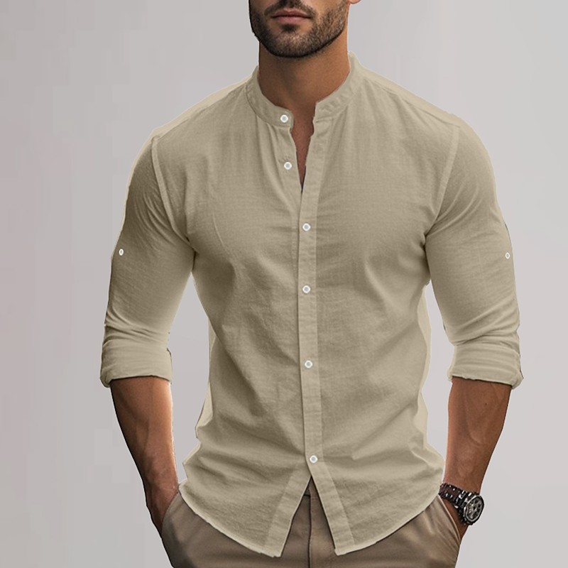 Men's Cotton Linen Shirt Plain Vacation Black White Khaki Dark Gray Long Sleeve Grandad Collar Clothing Apparel