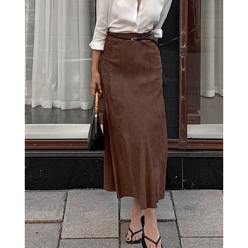 Women's Skirt Elegant Vintage Midi Mid Rise Skirts Plain Ruched Micro-elastic Vacation Street Brown Fall Spandex