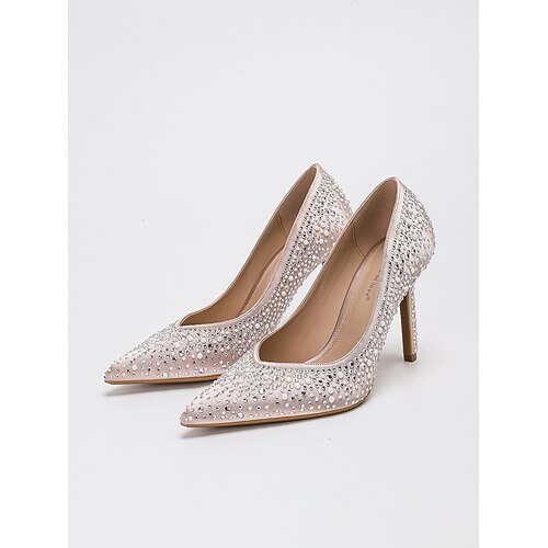 Décolleté da donna bianche con tacco a spillo decorate con cristalli, eleganti scarpe con tacco alto per la madre della sposa per matrimoni in città, scarpe eleganti a punta scintillanti per la sera