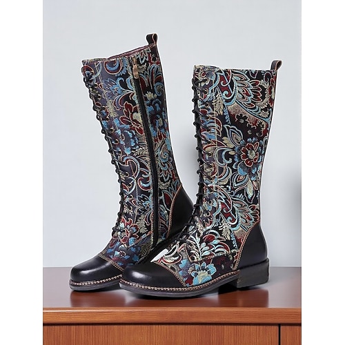 Damen-Kniestiefel im Vintage-Stil der 1950er Jahre mit roter Stickerei und Blockabsatz zum Schnüren – Lederstiefel mit Blumenmuster für Freizeitkleidung und Western-Stil