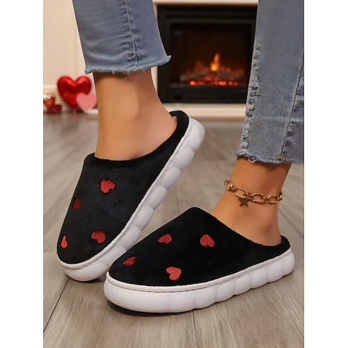 Weiße, flauschige Damen-Hausschuhe aus Fleece mit roter Herzstickerei – warme, flauschige Hausschuhe mit dicker Sohle für Schlafzimmer, Valentinstag und als Geschenk