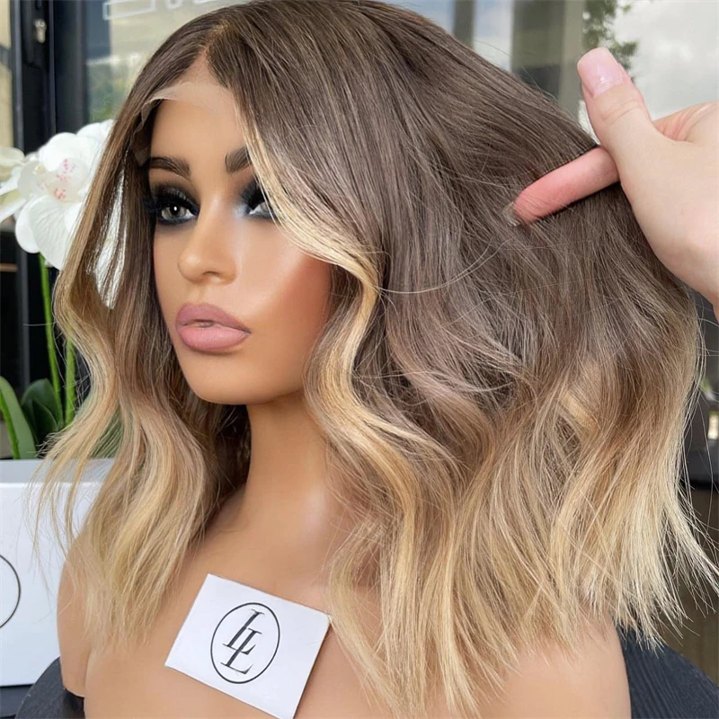Brazilian Remy Human Hair Ombre Glueless 5x5 Lace Closure Wigs Short Bob Wavy 13x4 Lace Front Wig Ash Blonde Human Hair Wig with Baby Hair Natural Hairline For Women