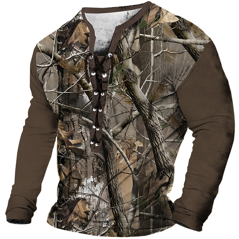 Men's Camouflage T shirt Tee Short Sleeve T shirt 3D Print Lace Up Neck Shirt Casual Vintage Retro Sports Outdoor Casual Daily Black Brown Army Green Spring Summer Clothing Apparel S M L XL XXL XXXL