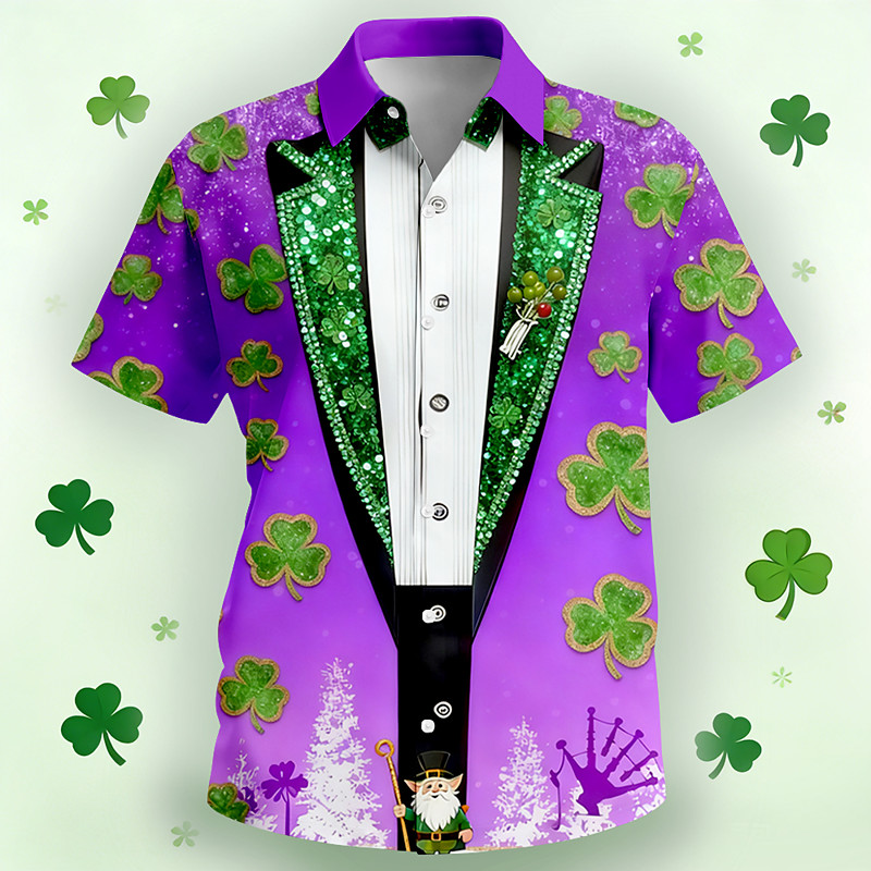 St. Patrick's Day Men's Shamrock Faux Collar and Suit Design Shirt Button Up Shirt Short Sleeve Fashion Casual Party Holiday Summer Spring Turndown 3D Print Collared Shirts Purple Orange Green