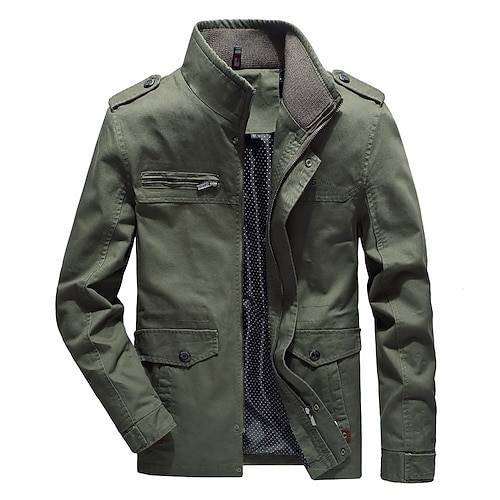 Per uomo Giacca utility Giacca di transizione Uscire Tasca con cerniera Primavera Autunno Tinta unita Militare Colletto Mao Regolare Cotone Vestibilità regolare Nero Verde militare Cachi Giacca