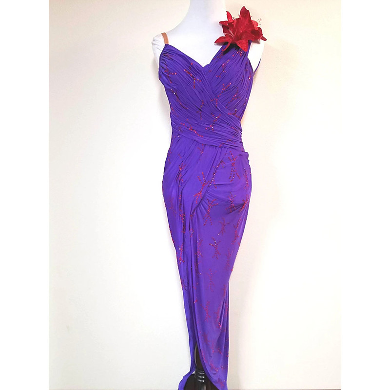 Women's Latin Dance Dress Violet Purple Draped One-Shoulder Flower Embellished Competition Costume for Rumba Tango Paso Doble