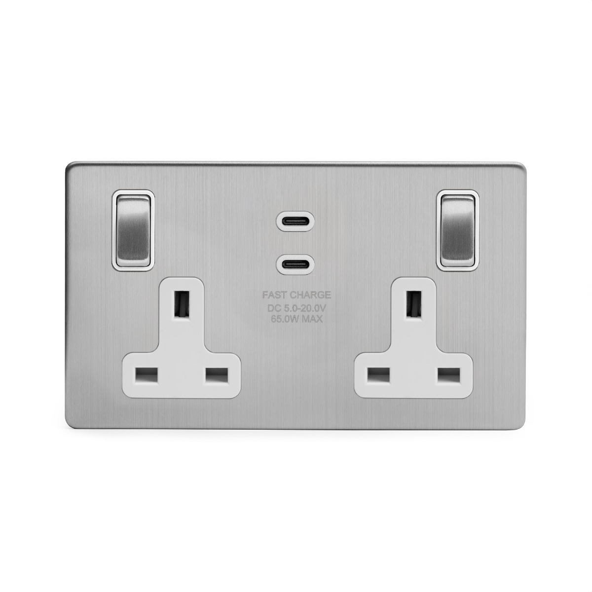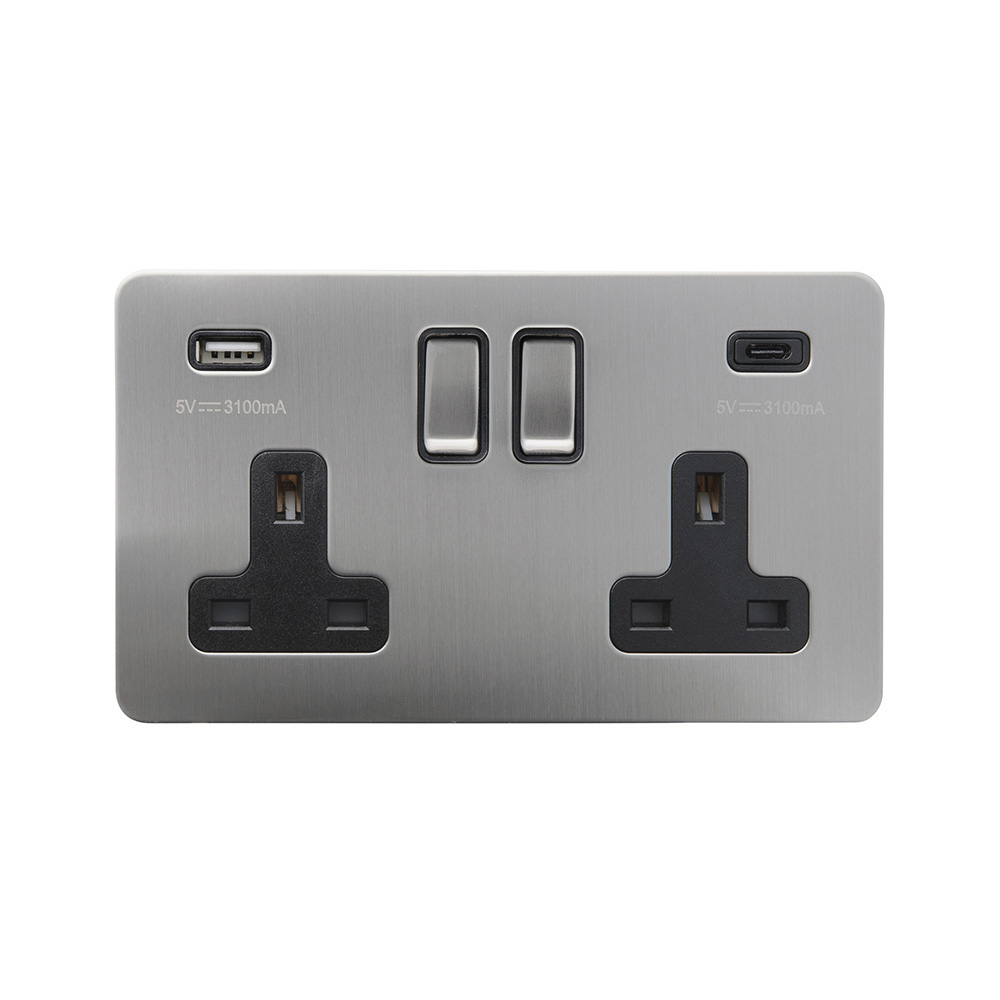 Soho Lighting Brushed Chrome Flat Plate 2 Gang USB A+C Socket (13A Socket + 2 USB Ports A+C 3.1A)