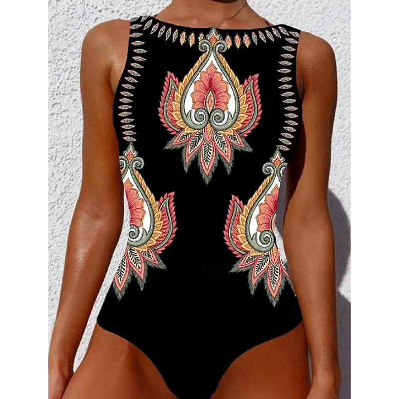 Women's One Piece Swimsuit Slimming Boho Monokini Backless Tummy Control High Waist Slim Vacation Beach Wear Geometric Round Neck Sleeveless Bathing Suits