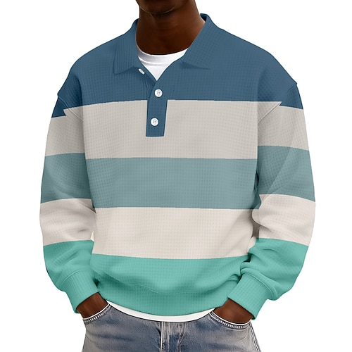 Men's Horizontal Stripes Waffle Polo Shirts Rugby Polo Rugby Polo Shirts Long Sleeve Polo Shirts Lapel Sportswear Casual School Athleisure Daily Wear 3D Print Spring Fall Winter Blue Brown Green
