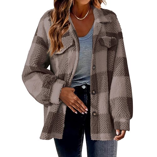 Per donna Cappotto Invernale Giacca Sherpa Caldo Confortevole Tasca Bottoni Casual Plaid Vacanza Casuale Uscire Weekend Regolare Collo ripiegato Vestibilità regolare Manica Lunga Capispalla Nero Rosa