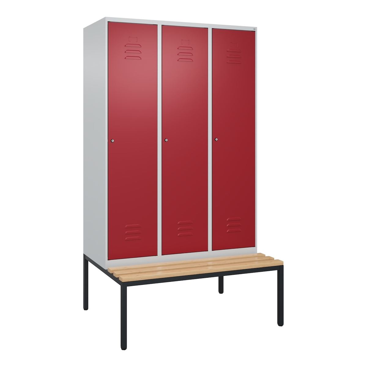 C+P Spind Classic PLUS, Buche untergebaute Sitzbank 3 Abteile, HxBxT 212x120x82cm, Zylinderschloss, Hellgrau/Rubinrot von PROREGAL