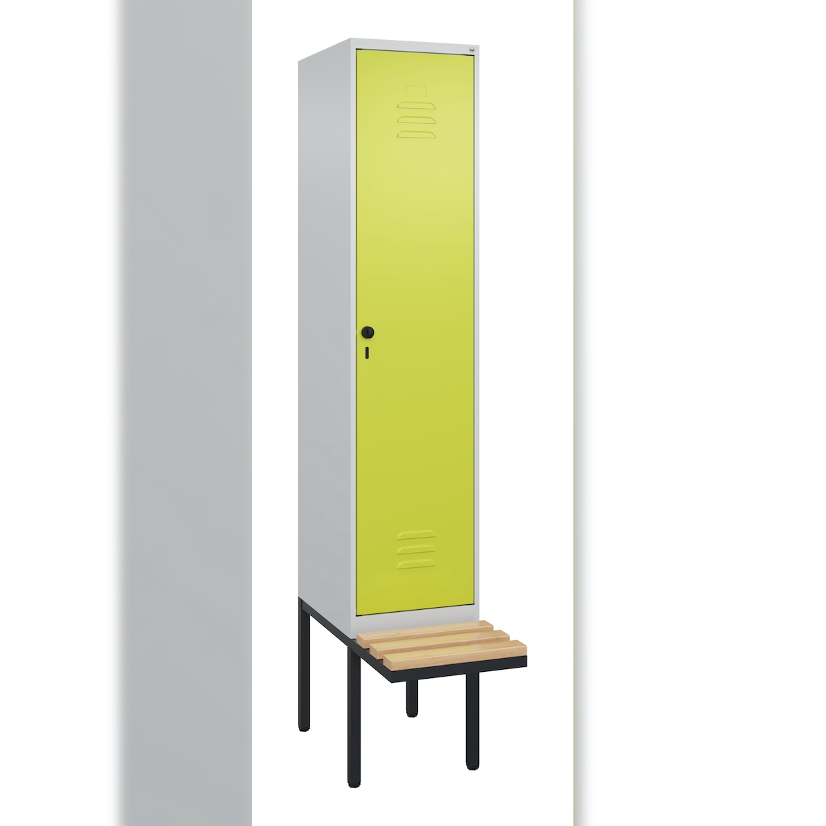 C+P Spind Classic PLUS, schwebender Sitzbank aus Buche 1 Abteil, HxBxT 212x40x82cm, Sicherheitsdrehriegel, Hellgrau/Clowngrün von PROREGAL