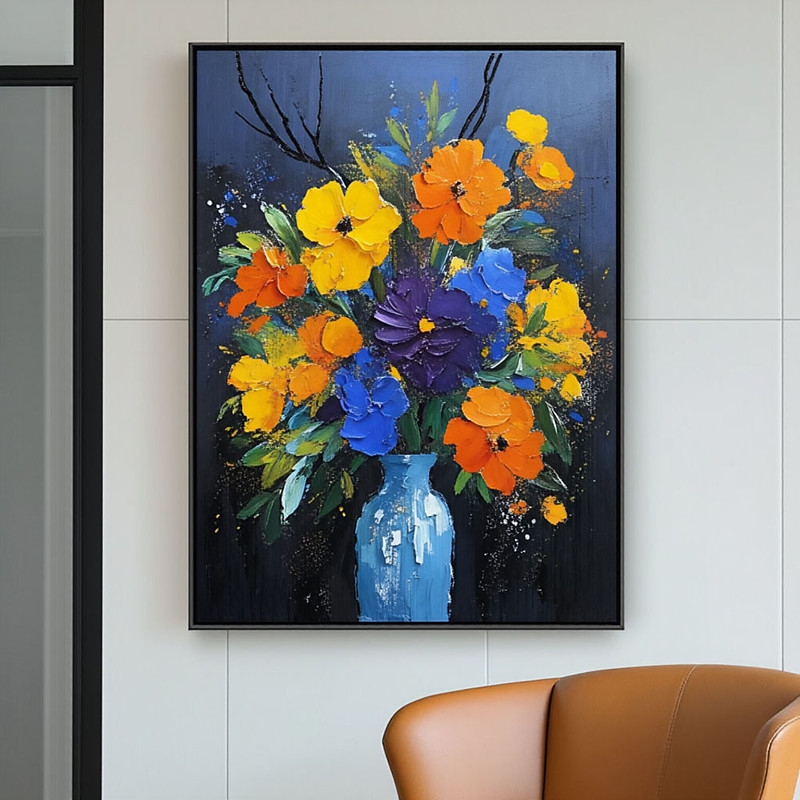 Handmade Blue Flowers in Vase Pictures Background Bouquet Canvas Art Wall Painting Colorful Aesthetic Posters Painting for Home Decor