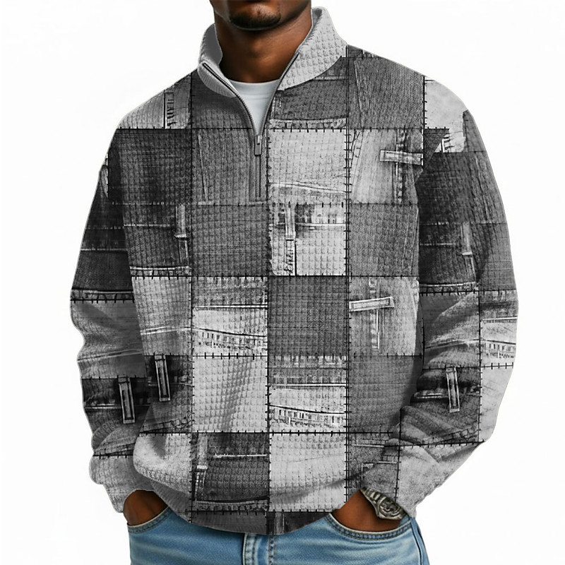 Men's Plaid Waffle Sweatshirt Fashion Daily Classic Casual Stand Collar Quarter Zip Home Outdoor Office Work Blue Lake blue Purple Brown Gray Zip Up Fall Winter Designer S M L XL XXL XXXL