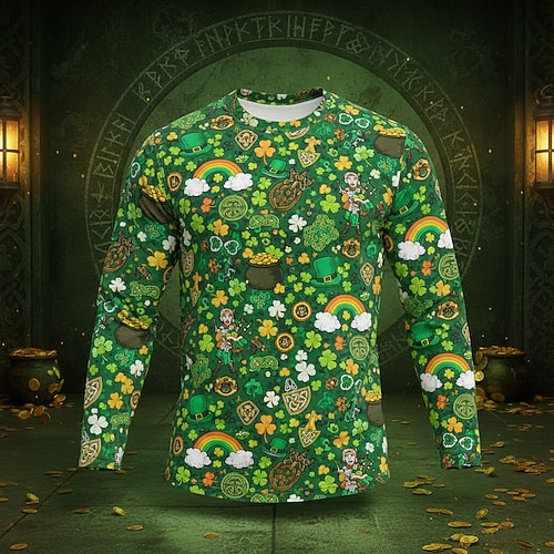 T-shirt a maniche lunghe per uomo per il giorno di San Patrizio, maglietta grafica con trifoglio irlandese fortunato, scollo rotondo con stampa 3D, top per il giorno di San Patrizio