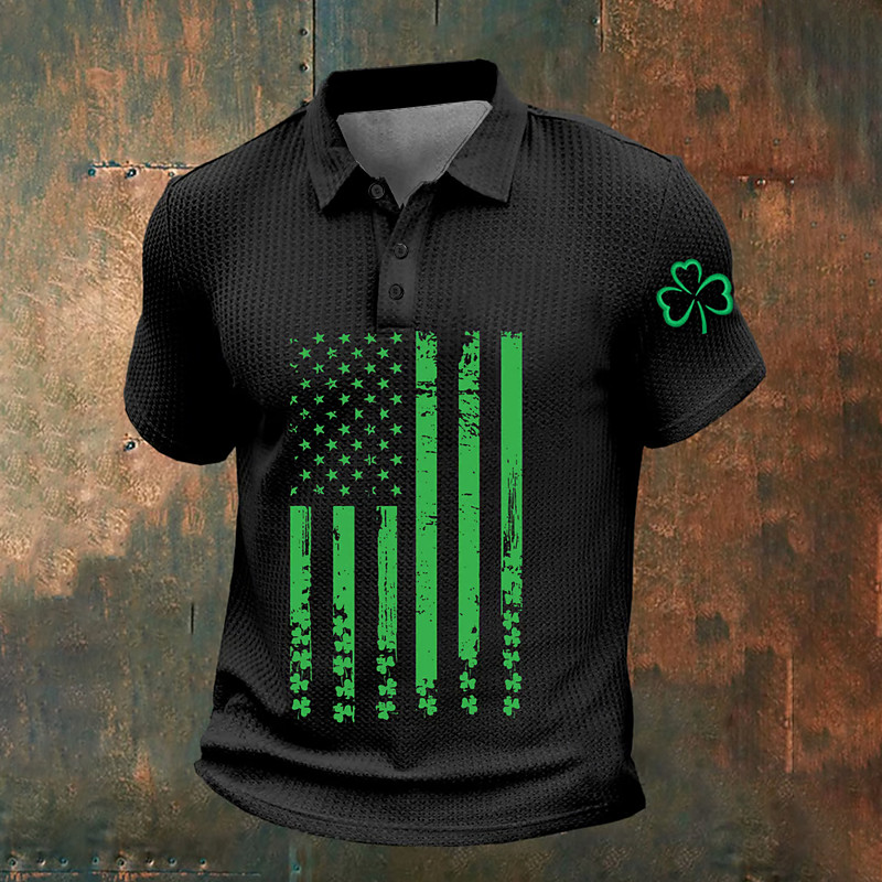 St. Patrick Men's Shamrock American US Flag Waffle Polo Shirts Short Sleeve Polo Shirts Collared Shirts Casual Outdoor Dailywear Festival Outfit 3D Print Buttons Summer Black White Light Green